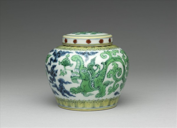 這件蓋罐的器口寬直,短頸,肩部稍寬,腹部上豐下斂而呈微弧圓,至底足內收。本件作品在腹部兩側各畫一尾夔龍首尾相接。龍首鼻梁部分如象鼻高揚,張嘴舌吐蓮花,雙足呈龜足狀帶有四爪,龍身成波曲狀行走,龍翼與龍尾繪畫成卷草紋狀,青花輪廓線內填以綠色釉彩,在行龍的周邊畫如意雲,以青花渲染之,器肩部及腹部底邊畫以俯仰的變形蓮瓣紋,再填以黃釉彩,蓋面寬平,蓋緣邊點以小花,花瓣內填紅釉彩,外底心以青花書一「天」字,整件圖飾活潑,色彩清晰可愛。「天」字蓋罐是成化鬥彩瓷器中極為特殊的一個類象,景德鎮珠山明代御廠故址附近一帶曾出土七種大小不同尺寸,底部均書寫「天」字款的蓋罐,而本院的典藏,除夔龍紋外,尚有天馬紋及海獸波濤文蓋罐。一般所稱「鬥彩」,意指透明釉下青花輪廓與釉上彩飾互相襯托輝映,互為相拼鬥妍。根據近代學者研究,「天」字款蓋罐因「天」字,而隱含有官方用器的含意。
