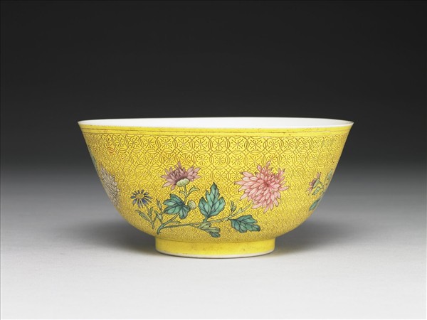 深弧壁,矮圈足,內底白釉上彩繪魚藻紋,外壁黃地上錐剔繡球花形錦紋,餘隙畫折枝菊花、野菊三枝,口、足留白並各錐剔線紋一道。胎薄透光,底藍料書「乾隆年製」四字二行楷款,外加雙方框。