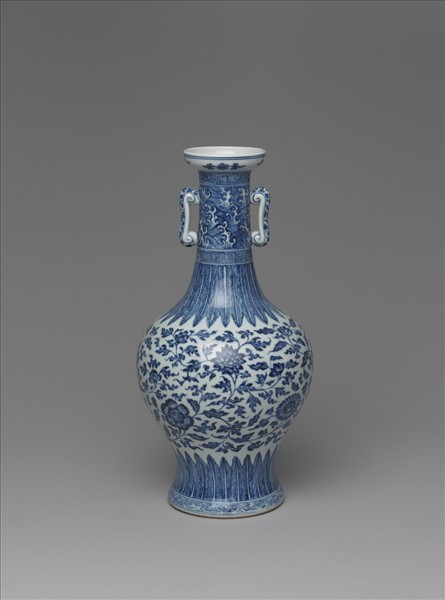 瓶,盤口寬唇,長頸,頸兩側貼飾弓形耳;溜肩,上腹圓碩下腹急斂,平底,撇足。外壁飾釉下青花繪飾,口沿下飾一圈朶花圖案,頸身滿飾海水江牙紋,上下各飾一道回紋。雙耳繪飾花草紋樣。頸肩一圈長形蕉葉紋,器腹滿繪纏枝花卉紋,脛足處繪蕉葉紋,底部弦紋間一道渦卷波浪紋樣。底以青花雙圈書「大清雍正年製」兩行楷款。