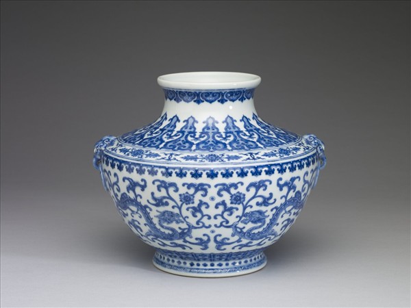 瓶,侈口,肩外侈,並銳折下斂為腹,折肩處飾兩獸形銜環耳,碩腹下斂,平底,圈足外撇。器壁以釉下青花繪飾,口沿下飾一道如意勾連紋,頸部圍繞一圈變形蕉葉圖案紋,間部二道弦紋間飾朵花及勾連等複合紋飾。肩下一圈花邊,腹部主體空間繪兩對龍紋,間飾纏枝花卉,器底至足依序為變形蓮瓣紋、蒲紋和圓渦紋。底以青花書「大清乾隆年製」篆書方款。