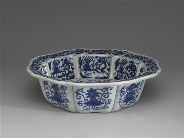 八方洗。侈口寬唇,淺壁,平底無足。器底內及內壁分別畫分為八格,格內各畫青花龍鳳一對,隙地飾以雲紋。器外壁每格畫青花纏枝番蓮托八寶。器底露胎,中心圓凹下,以青花書「大明萬曆年製」雙圈楷書款,上罩白釉。