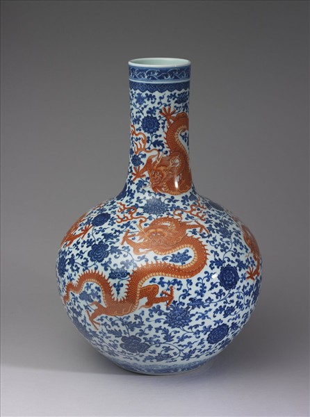 此品直口長頸,圓碩腹,平底,內挖淺圈足,器表描繪青花海水波濤、如意雲頭和纏枝番蓮紋;以礬紅畫正面朝前和側向行龍共五條。器內及底施白釉,中心書青花「大清乾隆年製」六字篆款。天球瓶的原型來自西亞金屬器,流行於明朝永樂(1403-1424)、宣德(1426-1435)時期,對照《活計檔》乾隆皇帝降旨仿燒「宣窯」作品的記事,可從中推論所仿亦應包含此一器式。同時康熙朝《萬壽盛典初集》也有將「宣窯萬壽天球尊」當成祝壽禮品。相較於永宣天球瓶,乾隆官窯仿燒成品於頸腹比例上,已出現頸較長、腹較短的時代風格。尤其是經過「造作則例」的規範,與此品相同的紋樣也出現在各種不同器形上。