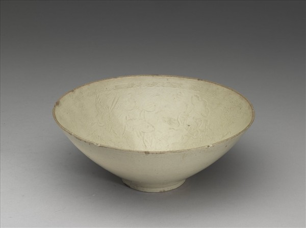 碗,六瓣葵花口,深斜壁,圓底,矮圈足。整器施白釉,釉色偏黃,口沿一圈露胎。器內口沿印回紋一道,內壁印蓮花水草,間飾鷺鷥兩對,鴨四隻,內底心印游魚兩尾;外壁樸素無紋。