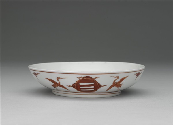 侈口碟,淺弧形壁,圈足矮寬。薄胎白釉,外壁畫礬紅雲鶴六隻,加飾乾坤二卦文。外口沿及底邊處各飾紅線弦紋一道,內壁純白無紋飾。