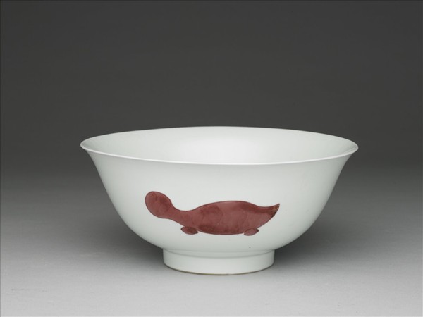 撇口碗,深壁,矮圈足。薄胎白釉,外壁畫銅紅魚三尾,內面樸素無紋飾。