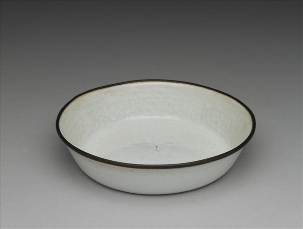 洗,侈圓口,淺斜壁,底心略凸,無足。胎骨稍厚,白釉微黃。底心有裂縫,口沿加鑲銅釦。器內口沿下印回紋一道,內壁印轉枝牡丹、菊花,內底邊緣印回紋一周,中心印蓮塘雙魚紋;外壁樸素無紋飾。