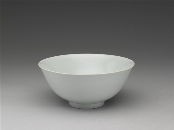 碗,侈口窄唇,深弧壁,矮圈足。胎質較薄,釉色甜白,整器樸素無紋飾。