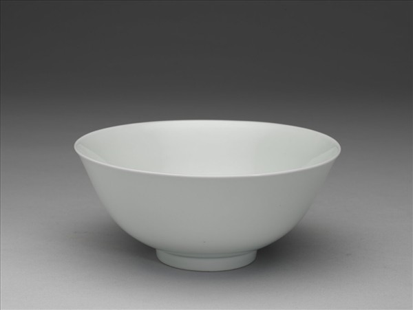 碗,侈口窄唇,深弧壁,矮圈足。胎質較薄,釉色甜白,整器樸素無紋飾。