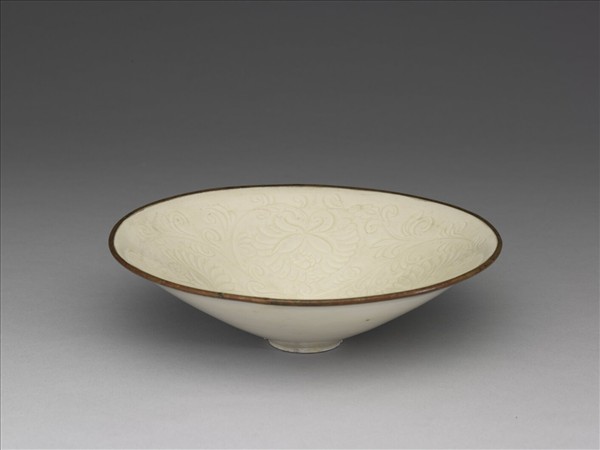 碗,敞口,弧壁,平底,矮圈足,口沿鑲金屬釦。全器施白釉,釉色泛黃。內壁劃四朵纏枝牡丹。
