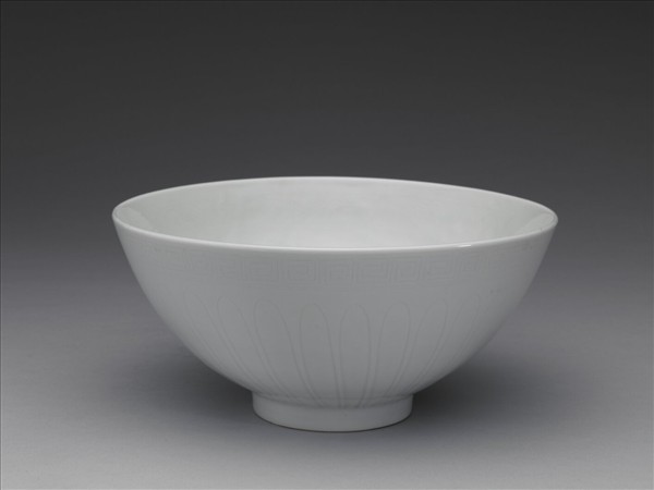 大碗,敞口,深壁,平底,矮圈足。全器施白釉,足底露胎。器外壁口沿下刻劃回紋一道,器壁劃花瓣紋一周,內壁淺印四季花卉。