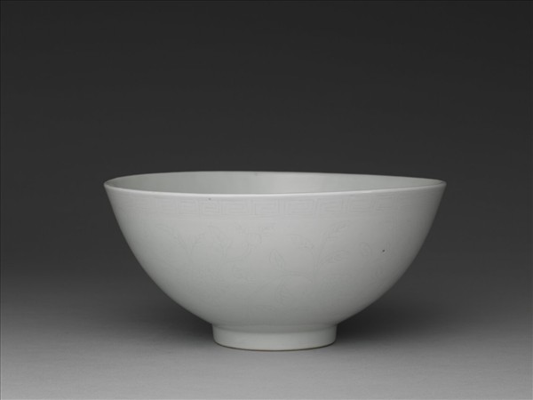 大碗,敞口,深壁,平底,矮圈足。全器施白釉,足底露胎。器外壁口沿下刻劃回紋一道,器壁劃四季花卉,內壁刻花瓣紋一周。