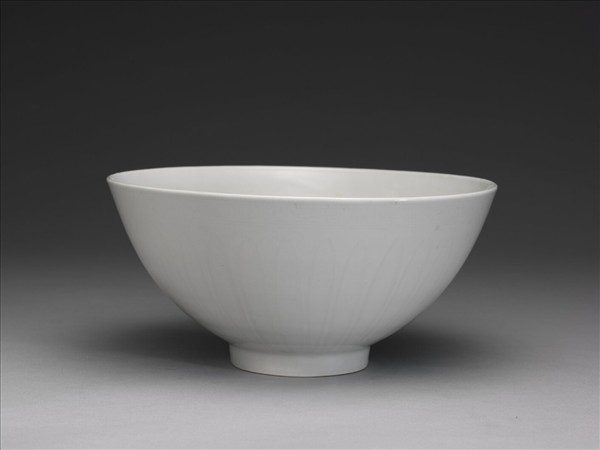 大碗,敞口,深壁,平底,矮圈足。全器施白釉,足底露胎。器外壁口沿下刻劃回紋一道,器壁劃花瓣紋一周,內壁印四季花卉。