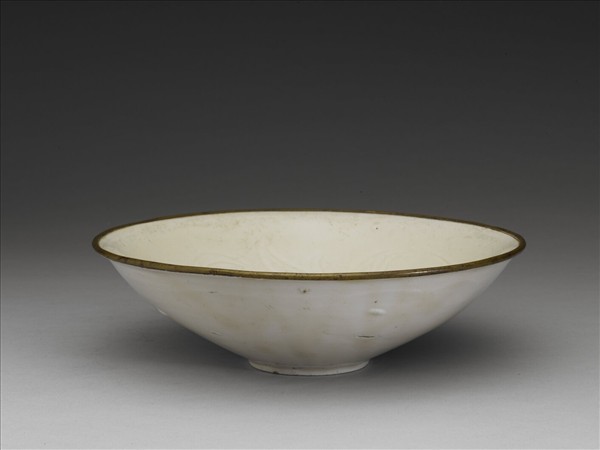 碗,侈口,深壁,平底,矮圈足,口沿鑲金屬釦。全器施白釉,釉色泛黃。器外壁樸素無紋,器內壁劃蓮花紋飾。