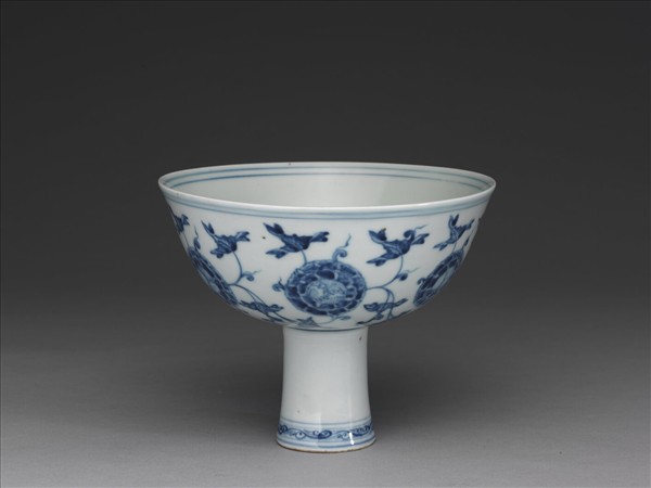 高足碗,侈口,深壁,高足微侈,足中空。青花釉彩,口沿內外壁飾弦紋兩道,器身繪花鳥樹果圖紋。器內底心兩圈內繪折枝牡丹,外壁器身銜接足處及足底各飾弦紋兩道,足壁飾如意雲頭紋。