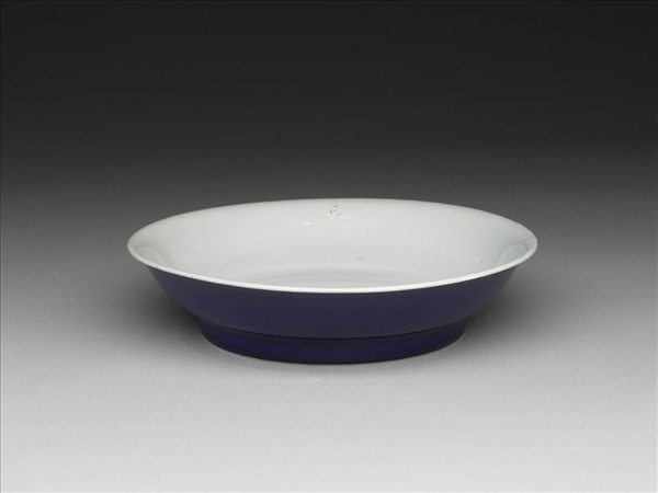 侈口,淺壁弧形,矮圈足。胎質稍厚,外壁施霽青釉,內壁錐拱雙龍紋,模糊不清。盤心及底純白,樸素無紋飾。底有「大明宣德年製」六字二行楷體暗款,外加雙圈。