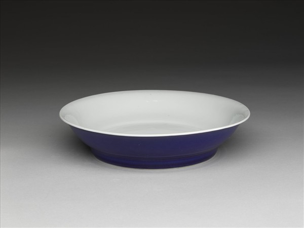 侈口,淺壁弧形,矮圈足。胎質稍厚,外壁施霽青釉,內壁錐拱雙龍紋,模糊不清。盤心及底純白,樸素無紋飾。底有「大明宣德年製」六字二行楷體暗款,外加雙圈。