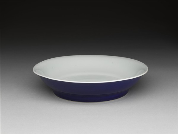 侈口,淺壁弧形,矮圈足。胎質稍厚,外壁施霽青釉,內壁錐拱雙龍紋,模糊不清。盤心及底純白,樸素無紋飾。底有「大明宣德年製」六字二行楷體暗款,外加雙圈。