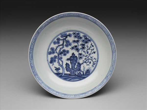 折沿侈口,淺壁,矮圈足。內口沿下畫卷草紋一周,盤心與外壁均畫松、竹、梅、加飾靈芝、湖石。內壁白釉上印飾雙龍暗花紋,印紋較淺,不易辨識,內外共加飾青線八道。胎骨均勻,內心微凹,圈足露胎,質堅細膩。青花釉色濃重,帶褐綠疵斑。底書「大明宣德年製」二行六字楷款,外加雙圈。