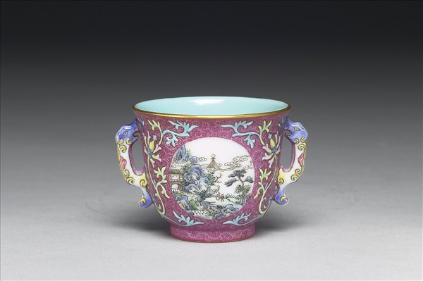 杯作圓式。杯口微撇,深腹,雙龍耳,圈足。外壁及圈足均為紅地錐剔鳳尾形卷草錦地紋,上開光山水人物畫。口足均描金彩,杯內及底施湖綠釉,杯底心白地框內均青花書「乾隆年製」四字二行篆款。
