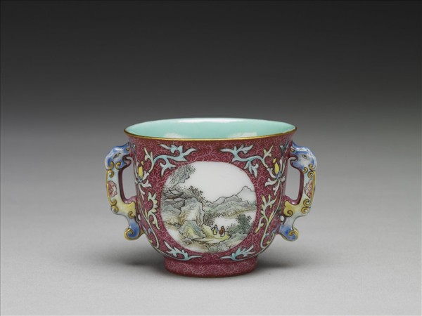 杯,口微撇,深腹,雙龍耳,圈足。外壁及圈足均為紅地錐剔鳳尾形卷草錦地紋,二開光內繪山水人物畫,開光兩側勾繪圖案式洋花。口足緣均描金彩,內壁及外底施湖綠釉,外底心白地框內有青花書「乾隆年製」四字二行篆款。