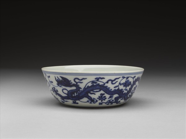 敞口,淺壁,底心凸起,淺圈足。薄胎白釉,碗心及外壁分畫龍鳳各一條,隙地飾以纏枝花卉,口足內外加飾青線六道。底有青花書「大明嘉靖年製」二行六字楷款,外加雙圈。