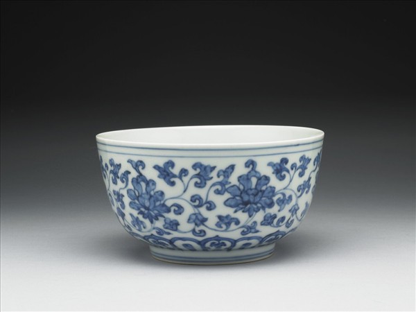 圓口,深壁而略斂,有圈足。器壁以青花卉纏枝番蓮紋為飾,近圈足處則有青花蓮瓣紋一圈。足與近口緣處均有兩道弦紋。圈足內書有「正德年製」四字楷款,款外以雙圈圍住。