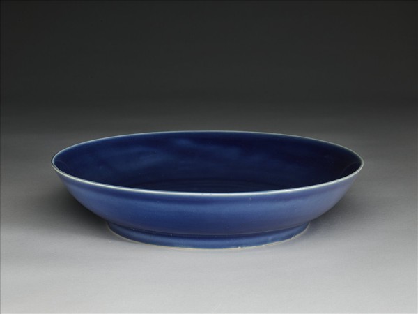 侈口窄唇,淺弧形壁,矮圈足。全器施霽青釉,施釉至足邊,口沿與足邊各留一道白邊,足緣無釉露白胎。足內壁及底施白釉,底有「大明萬曆年製」六字二行楷體暗款,外加雙圈。