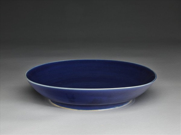侈口窄唇,淺弧形壁,矮圈足。全器施霽青釉,施釉至足邊,口沿與足邊各留一道白邊,足緣無釉露白胎。足內壁及底施白釉,底有「大明萬曆年製」六字二行楷體暗款,外加雙圈。