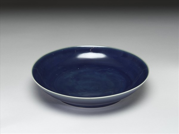 侈口窄唇,淺弧形壁,矮圈足。全器施霽青釉,施釉至足邊,口沿與足邊各留一道白邊,足緣無釉露白胎。足內壁及底施白釉,底有「大明萬曆年製」六字二行楷體暗款,外加雙圈。