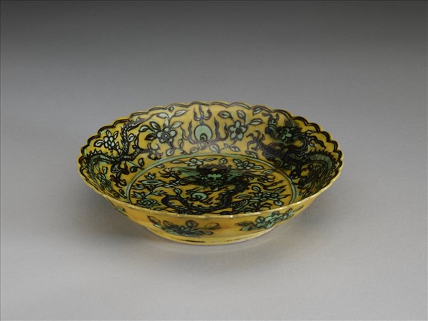 黃地綠彩花卉龍紋花口盤