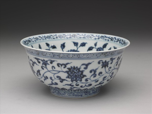 侈口窄唇,深壁,矮圈足。薄胎白泑。口唇上畫轉枝小菊花一週,內壁畫纏枝牡丹、菊花等五朵,碗心畫番蓮一枝。外面口緣下畫回紋,週壁畫纏枝番蓮五朵,底邊畫蓮瓣紋,足圈畫勾雲紋。內外花紋間加飾青線十道。