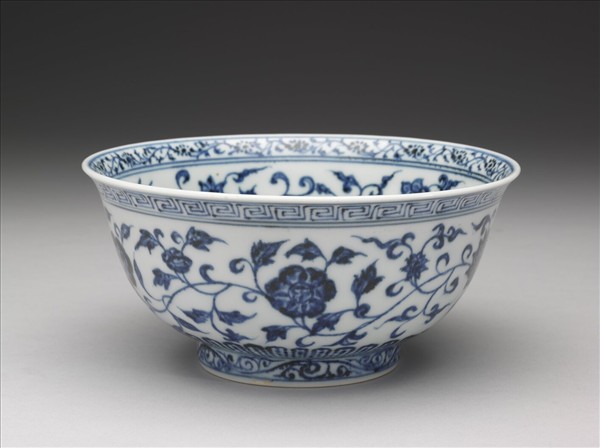 侈口窄唇,深壁,矮圈足。薄胎白泑。口唇上畫轉枝小菊花一週,內壁畫纏枝牡丹、菊花等五朵,碗心畫番蓮一枝。外面口緣下畫回紋,週壁畫纏枝番蓮五朵,底邊畫蓮瓣紋,足圈畫勾雲紋。內外花紋間加飾青線十道。