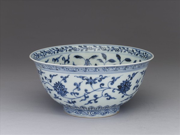 侈口窄唇,深壁,矮圈足。薄胎白泑。口唇上畫轉枝小菊花一週,內壁畫纏枝牡丹、菊花等五朵,碗心畫番蓮一枝。外面口緣下畫回紋,週壁畫纏枝番蓮五朵,底邊畫蓮瓣紋,足圈畫勾雲紋。內外花紋間加飾青線十道。