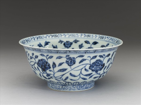 侈口窄唇,深壁,矮圈足。薄胎白泑。口唇上畫轉枝小菊花一週,內壁畫纏枝牡丹、菊花等五朵,碗心畫番蓮一枝。外面口緣下畫回紋,週壁畫纏枝番蓮五朵,底邊畫蓮瓣紋,足圈畫勾雲紋。內外花紋間加飾青線十道。