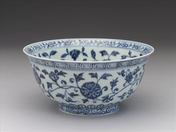 侈口窄唇,深壁,矮圈足。薄胎白泑。口唇上畫轉枝小菊花一週,內壁畫纏枝牡丹、菊花等五朵,碗心畫番蓮一枝。外面口緣下畫回紋,週壁畫纏枝番蓮五朵,底邊畫蓮瓣紋,足圈畫勾雲紋。內外花紋間加飾青線十道。
