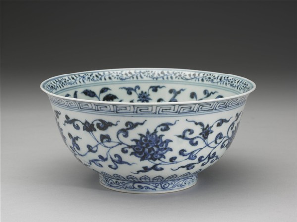 侈口窄唇,深壁,矮圈足。薄胎白泑。口唇上畫轉枝小菊花一週,內壁畫纏枝牡丹、菊花等五朵,碗心畫番蓮一枝。外面口緣下畫回紋,週壁畫纏枝番蓮五朵,底邊畫蓮瓣紋,足圈畫勾雲紋。內外花紋間加飾青線十道。
