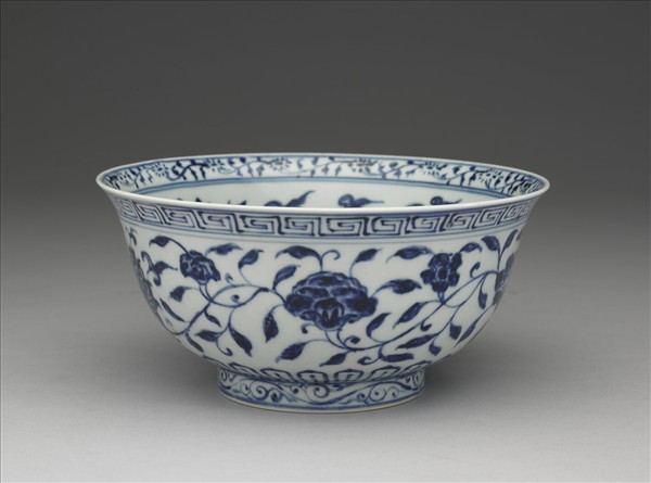 侈口窄唇,深壁,矮圈足。薄胎白泑。口唇上畫轉枝小菊花一週,內壁畫纏枝牡丹、菊花等五朵,碗心畫番蓮一枝。外面口緣下畫回紋,週壁畫纏枝番蓮五朵,底邊畫蓮瓣紋,足圈畫勾雲紋。內外花紋間加飾青線十道。