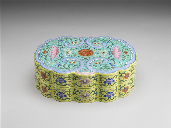 粉彩黃地纏枝花卉紋如意式盒