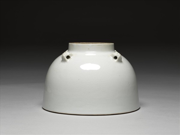 罐、斂口、短頸、碩腹、淺圈足;肩飾凸額、高眼瞼、厚唇的鋪首四個。鋪首的背面開一圓孔,以便穿繩。胎骨厚重,釉色白中泛青,器身淺劃纏枝重瓣菊花。口內及底均露胎,燒成火石紅。應屬於康熙時期的作品。四繫罐具有儲物功能,附金屬內膽之後成為花器。內膽蓋面中央設一個梅花型孔洞,周繞五個圓孔,孔洞的邊沿滾邊加厚,屬於明晚期或清初金屬內膽的造型。