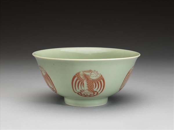 冬青釉描紅團鳳紋碗