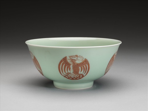 冬青釉描紅團鳳紋碗