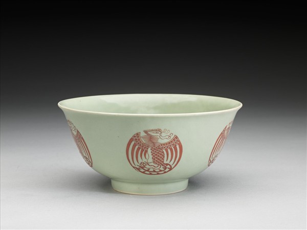冬青釉描紅團鳳紋碗