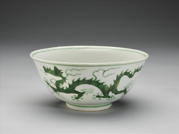 侈口窄唇,深壁,矮圈足。碗心與外壁刻畫雲龍三條,外壁隙地淺劃山石、波濤紋。內壁純白,樸素無紋飾,薄胎白釉,龍紋加填綠彩。底有青花書「大明正德年製」二行六字楷款,外加雙圈。