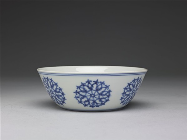 侈口,矮壁,平足底凹。外壁以青花繪飾六朵雪花樣圖案花紋,器內素白無紋。口足各飾青線二道。底青花書「大明成化年製」雙圈六字楷款。