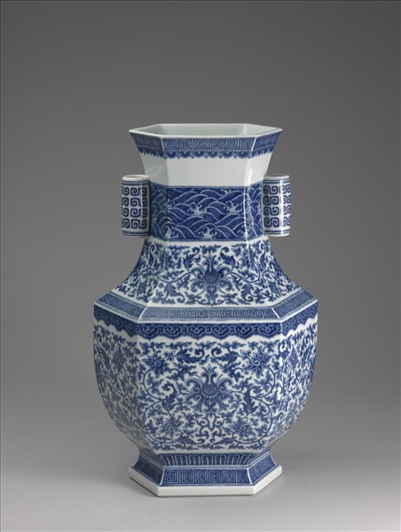 壺,器身呈六方形,撇口、短頸、碩腹、矮圈足,頸部附二相對管狀貫耳。胎骨厚重,器身以青花彩繪紋飾,通體施白釉,足緣無釉露胎。器外口沿繞回紋及葉形圖案;頸部上段留白,中段飾波濤紋,下段滿繪纏枝番蓮;肩部繞回紋一周,下接如意雲紋;腹壁滿繪纏枝番蓮,近底部加飾一層蓮瓣紋,外足圈亦以回紋為飾;外壁所繪之回紋及波濤紋上下多有雙弦紋。雙耳紋飾上下對稱,最外圍繞單弦紋、雙弦紋,內填回紋四層。外底有青花書「大清雍正年製」六字三行篆款。