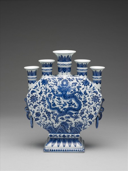 五孔花插,器身呈扁八方形,下接長方圈足,上有五並排喇叭形口、長短不一,最高者置中,左右各有二口、高度向外遞減,腹壁兩側分別飾一環耳。胎骨厚重,表面以青花彩繪紋飾,通體施白釉,足緣無釉露胎。五口頸部均有蕉葉紋及如意雲紋,兩種紋飾間有一道形似回紋之圖案;器外壁雙面紋飾相同,見一雲龍騰於波濤之上,周圍滿繪轉枝番蓮;足徑繞番蓮紋一周,下接蕉葉紋,近底處飾圈點紋、上下另加雙弦紋。外底有青花書「大清乾隆年製」六字三行篆款。
