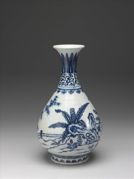 瓶,撇口、細頸、斜肩、垂腹、矮圈足,此器型一般通稱為「玉壺春瓶」。通體施青花釉彩,足緣無釉露胎。器外壁頸部共有三層紋飾,從上到下分別為蕉葉紋、纏枝花葉及如意雲紋,紋飾間以雙弦紋作區隔;腹部繪竹、石、芭蕉等三友紋,栽植於圍欄內,其間另點綴花草,近底處繞蓮瓣紋;外足圈飾花卉一周,上下另加雙單弦紋。內足圈及外底無紋飾,亦無款。