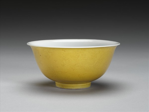黃釉白裡劃花龍紋碗