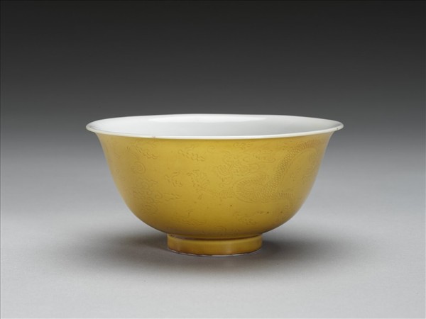 黃釉白裡劃花龍紋碗