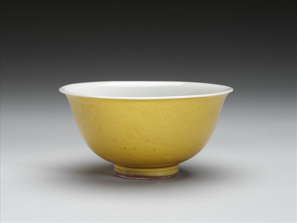 黃釉白裡劃花龍紋碗